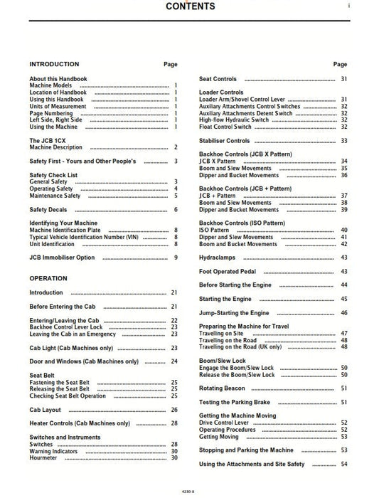 JCB 1CX OPERATOR MANUAL 9801/4230 SERIAL 751600 TO 752999 & FROM 806000 REPRINT