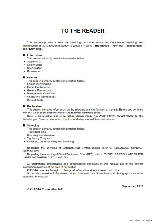 KUBOTA TRACTOR M8560 M9960 WORKSHOP SERVICE MANUAL REPRINTED 2012