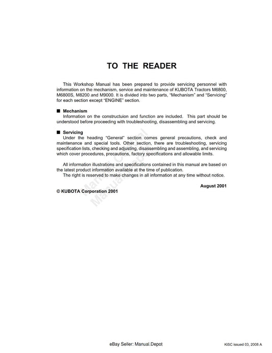 KUBOTA TRACTOR M6800 M6800S M8200 M9000 WORKSHOP SERVICE REPAIR MANUAL REPRINTED