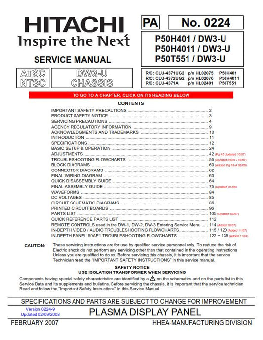 HITACHI P50H401 P50T501 P50H4011 PLASMA DISPLAY PANEL SERVICE MANUAL REPRINTED