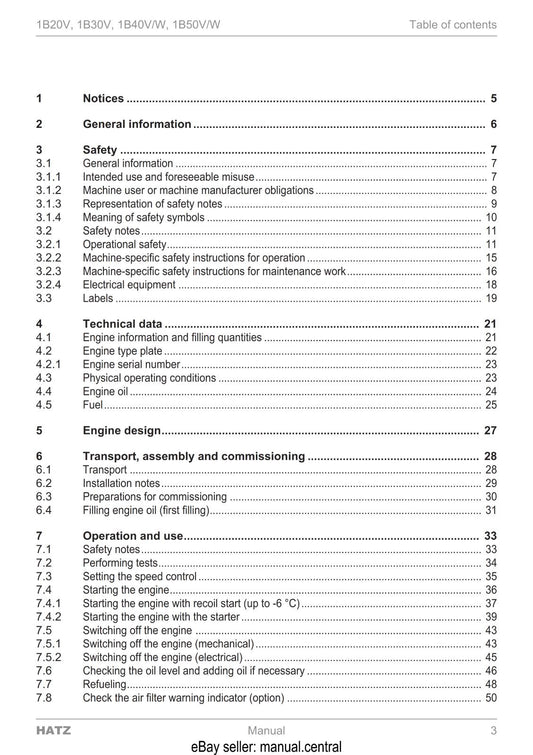 HATZ DIESEL ENGINE 1B 20V 30V 40V/W 50V/W COMMISSIONING OPERATING MAINTENANCE