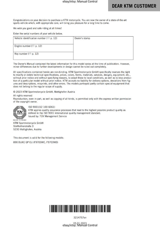 2023 OWNERS MANUAL - KTM 890 DUKE GP - REPRINT