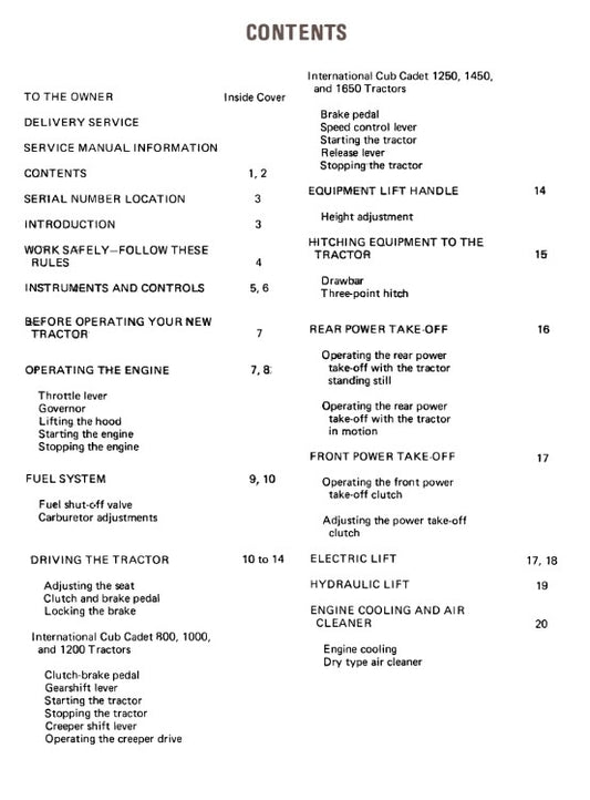 CUB CADET INTERNATIONAL 800 1000 1200 1250 1450 1650 TRACTOR OPERATORS MANUAL