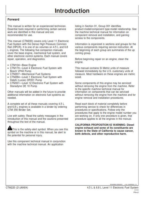 JOHN DEERE POWERTECH 4.5L 6.8L LEVEL 11 TECHNICAL MANUAL CTM220 REPRINTED