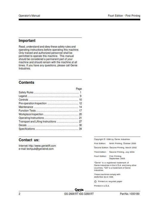GENIE GS-2668 RT GS-3268 RT OPERATOR MANUAL REPRINTED 2005 EDITION
