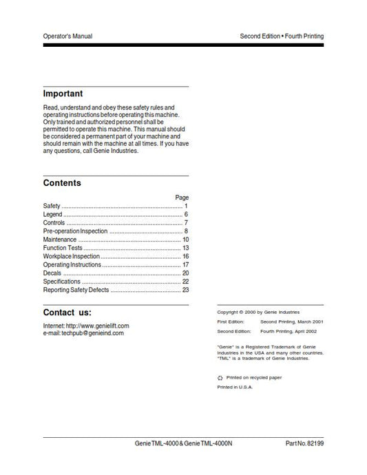 GENIE TML-4000 TML-4000N OPERATOR MANUAL REPRINTED 2002 EDITION