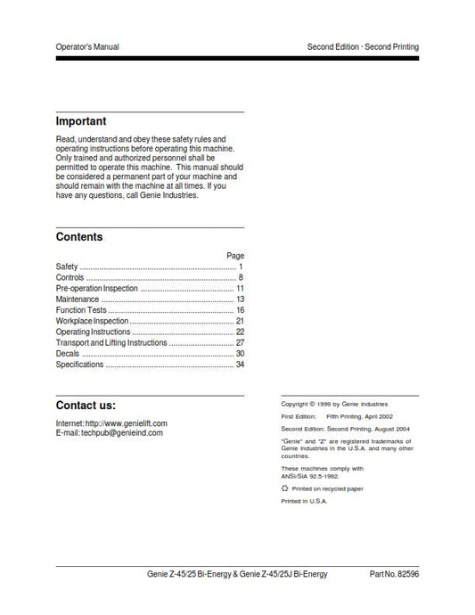 GENIE Z-45/25 J OPERATOR MANUAL REPRINTED AUG 2004 EDITION