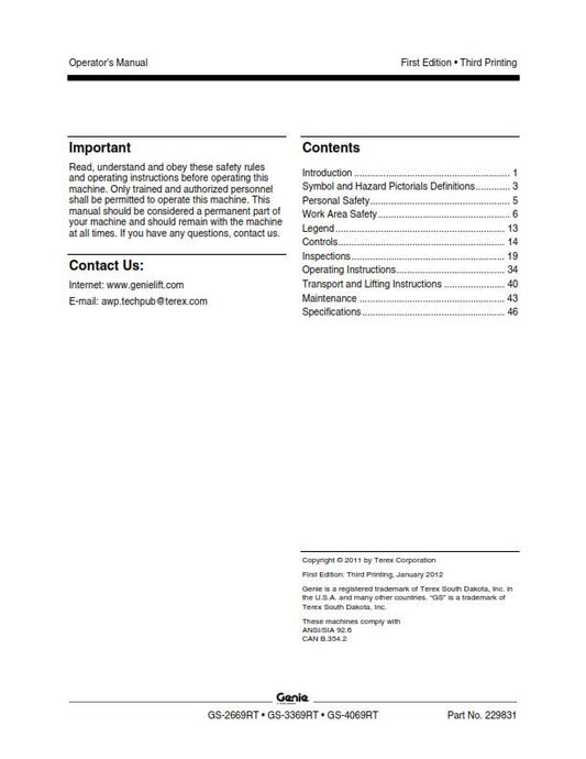 GENIE GS-2669RT GS-3369RT GS-4069RT OPERATOR MANUAL REPRINTED JAN 2012 EDITION
