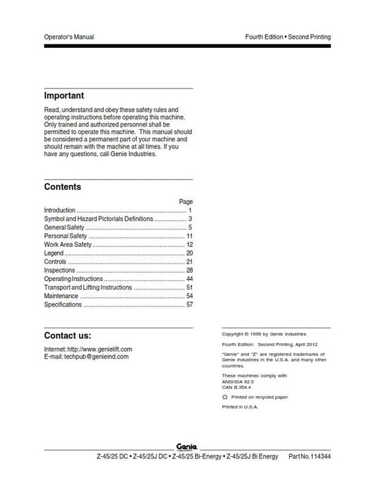 GENIE Z-45/25 J OPERATOR MANUAL REPRINTED AUG 2012 EDITION