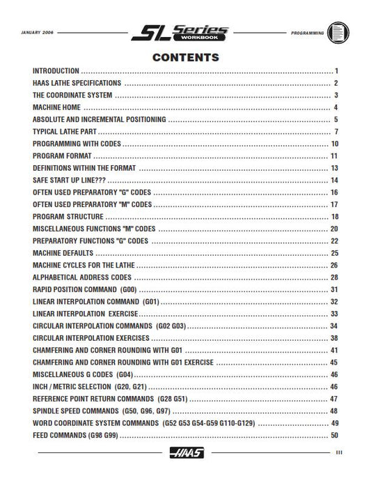 HAAS SL SERIES CNC MACHINE PROGRAMMING WORKBOOK MANUAL REPRINTED JAN 06