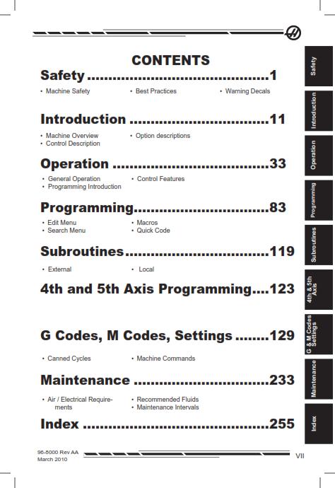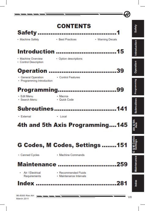 HAAS 96-8000 MILL OPERATOR MANUAL REV AH MARCH 2011 REPRINTED COMB BOUND