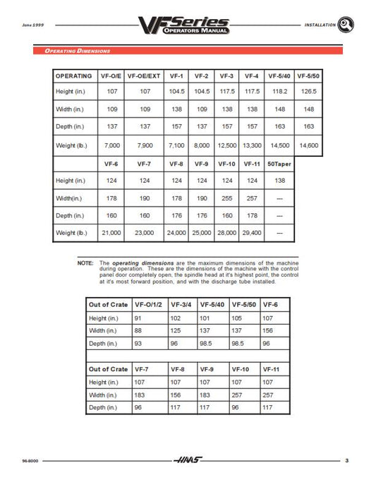 HAAS VF SERIES MILL INSTALLATION OPERATORS MANUAL JUNE 1999 EDITION COMB BOUND
