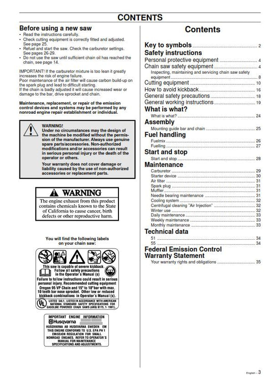 HUSQVARNA CHAINSAW 55 55 OPERATOR MANUAL REPRINTED COMB BOUND