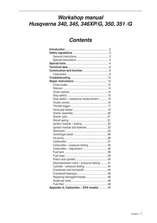 HUSQVARNA CHAINSAW 340 345 350 351 G 346 XP XPG WORKSHOP MANUAL REPRINTED