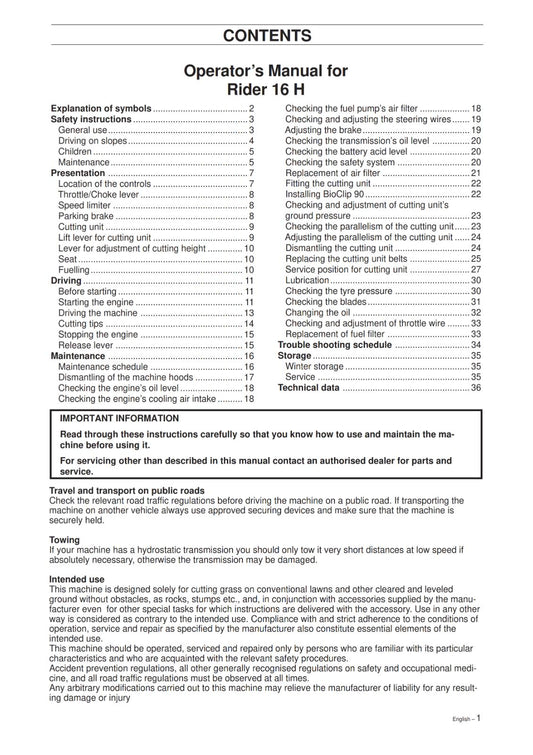 HUSQVARNA RIDE ON MOWER - RIDER 16 H - OPERATOR MANUAL REPRINTED