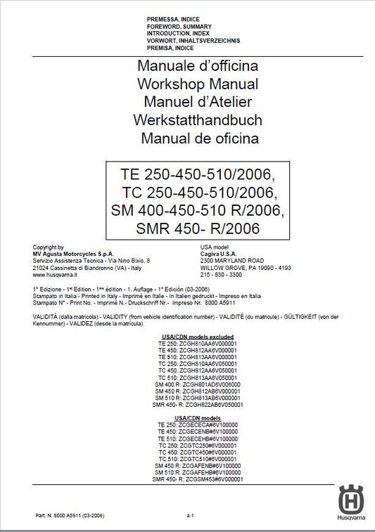 HUSQVARNA TE TC SM SMR 250 400 450 510 2006 REPAIR WORKSHOP SERVICE MANUAL
