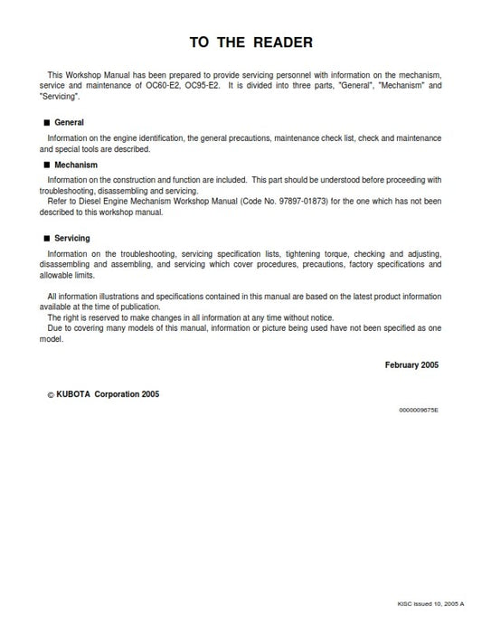 KUBOTA DIESEL ENGINE OC60-E2 OC95-E2 SERVICE WORKSHOP MANUAL REPRINTED 2005