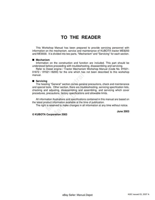 KUBOTA TRACTOR ME8200 ME9000 WORKSHOP SERVICE REPAIR MANUAL REPRINTED 2007