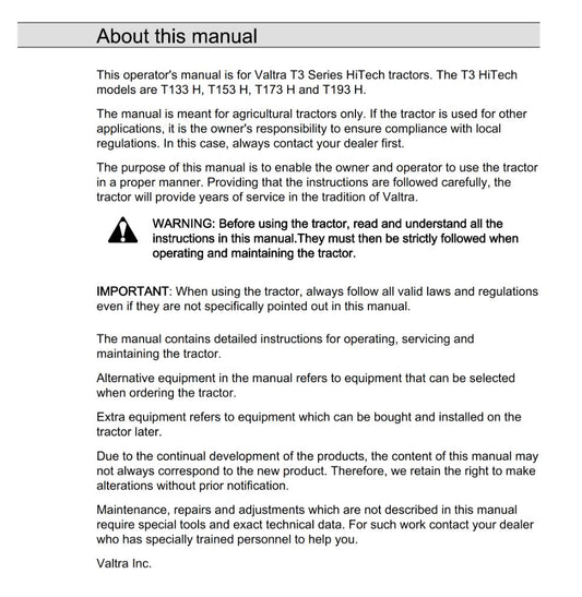VALTRA T3 HITECH T113 T153 T173 T193 OPERATORS MANUAL REPRINT COMB BOUND