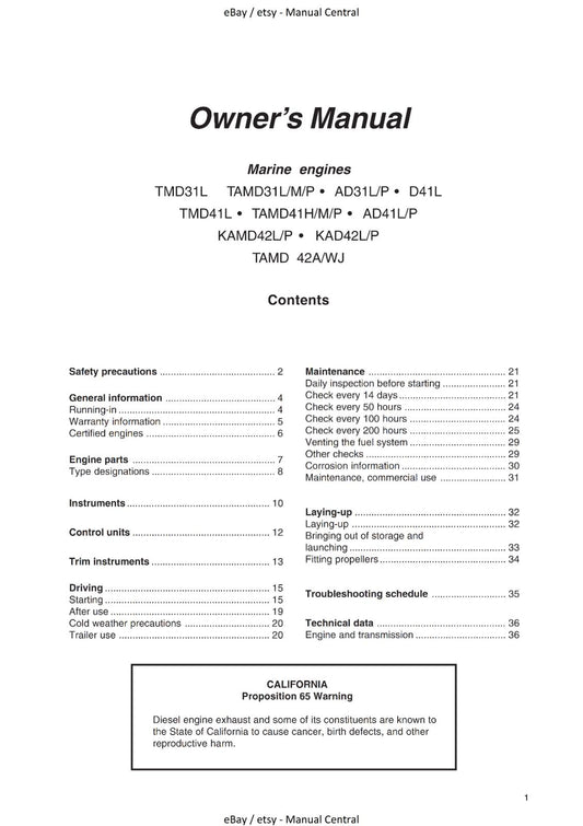 VOLVO PENTA ENGINE MD31 TMD31 TAMD31 AD31 TMD41 TAMD41 D41 AD41 OPERATOR MANUAL